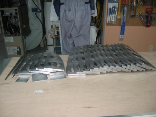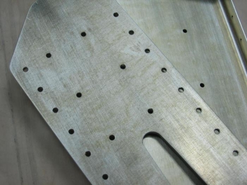 All right wing ribs, aft spar and aft spar doublers were cleaned, abraded with scotch brite, dried and then alodined. Image 1 is the ply of components air drying after being dried with a clean cloth. Image 2 is one of the aft spar doublers with the alodine anti-corrosion treatment completed.