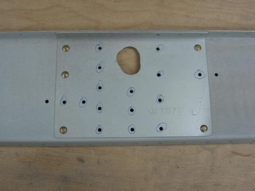 I managed to do one more hour today riveting up the left aft spar doublers. Image 1 shows the center doubler. Many holes are left unriveted at this point because the main ribs, elevator and aileron braces will get riveted in later on. For now I circled each hole that needed NOT to be riveted.