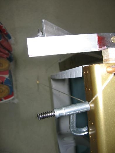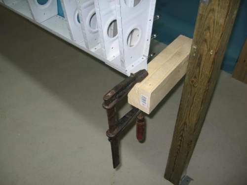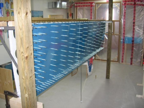 After having cut the wing walk doublers yesterday I match drilled both left and right wing walk doublers to the wing skins today. Then I clecoed the right wing inboard and outboard upper skins to the right wing skeleton with the wing walk doublers, see image 1. Then I dropped a plumb bob off the forward spar flange and measured the distance between the plumb line and the aft spar flange, see image 2. I had to adjust the inboard end by 1/8 inch to take a little twist out. I made a support for the aft inboard spar and clamped it to keep that position, see image 3. Next will be match drilling the skins.