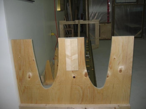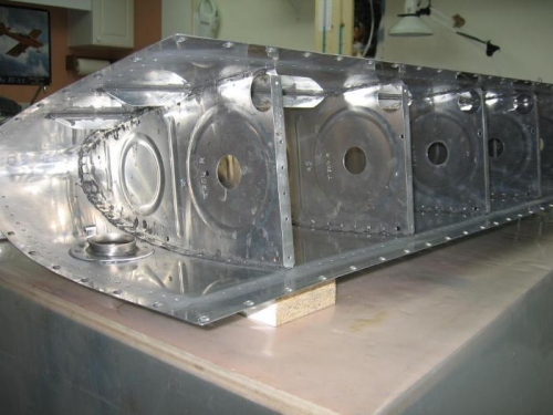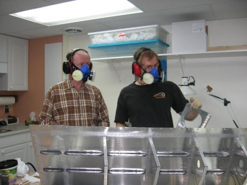 My brother Bernie came over and helped with fuel tank sealing work. In the first session we riveted and sealed in the tank skin stiffeners, the filler neck, the drain fitting and one rib. In a second session we riveted and sealed in several more ribs, see image 1 and 2. Also in the morning I finished the final steps on the wing storage stand. The leading edge cut outs on one side of the stand and the notches to hold the spars on the other end of the stand had to be cut as well as the spar support end needed a height adjustment, see image 3.