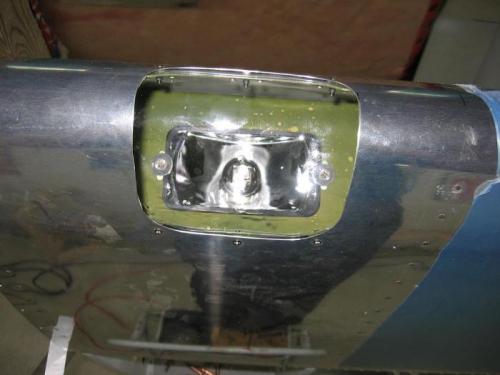 I completed the right wing landing light installation by drilling the leading edge lens holes to final size, deburring and dimpling them. I attached plate nuts to the lens retainers, installed the light assembly in the leading edge bracket, installed the bracket in the wing leading edge and fastened on the lens.