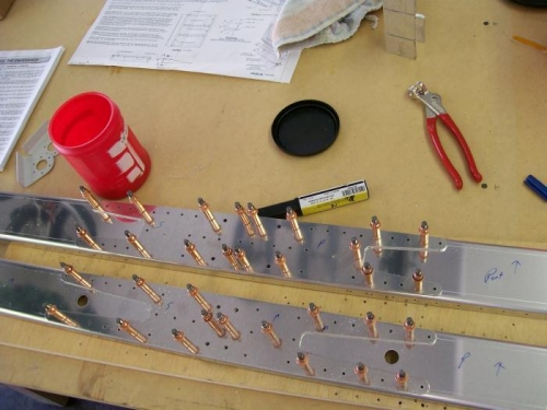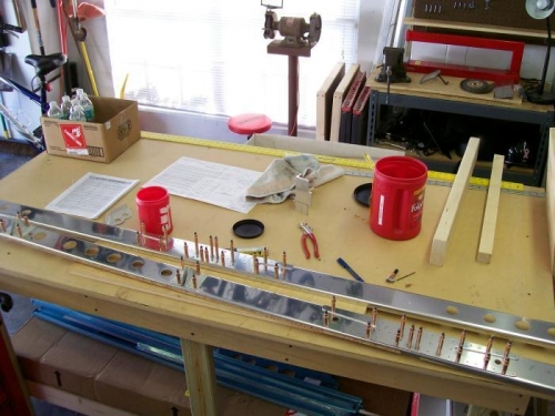 Couldn't sleep so I started in the shop @ 5:30. Couldn't make noise so I couldn'd finish the practice kit. Went ahead and started the emp. Layed out the spars with doublers.Finished the day with the skeleton put together but forgot to take pictures. I have taken it all back apart to deburr and countersink. I cut out the wood for the jig and have already sanded edges and lightning holes on the ribs. Tomorrow will be a lot of scotchbrite on the spars then reassemble to match drill the skins. After riding to breakfast this morning I made the 908 angle brackets out of the supplied aluminum angle. I goofed and cut one wrong. Almost enough scap to make another but not quite. I will look around town to see if anyone carries aircraft aluminum. I hate to order such a small piece and pay freight.