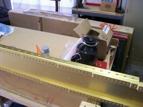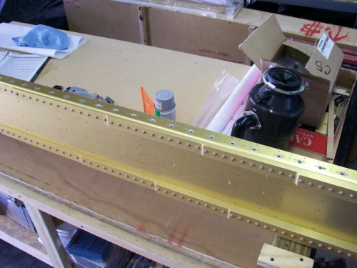 Finished Left spar prep today and I had originally planned on doing one wing at a time but it makes since to do both spars now so tomorrow I will move to the Right spar. First you rivet the tank mounting nut-plates to the spar flange x 62. All these require countersinking a fairly large countersink. Next the inspection access plate get plate-nuts on the spar flange. Then fabricate the tie-down angle and tap 3/8"-16 for an eyebolt. I am priming all of the counter sinks when removing anodizing. It is good to get back to work on the plane after about 3 weeks waiting on the wing kit.