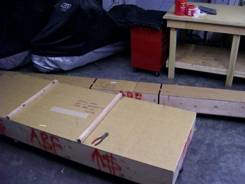 Wings arrive ABF freight today. Boxes are in perfect shape. Later in the evening I opened the crates and did a quick inventory. Seems like everything is there and undamaged. Haven't figured how to get it all stored so that Marsha can get her car back in the garage. I could find room for the spars but they ship the fusalage longerons with this kit and they are 15' long and a little diificult to store. I will probably put some brackets on the wall to store them up high.
