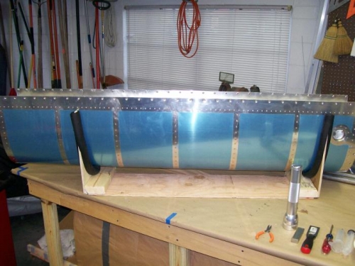 Vic from Southeast ramp in Sanford came by today to help with skin riveting. We completed the top inboard and outboard skins. I still need to rivet along the rear spar and J-channel. After Vic left I riveted the tank ribs that I had sealed Friday. Still more work to do on the tank. I will finish up the wing completely next week and build a storage stand so I can get it off the rig and start the Right wing.