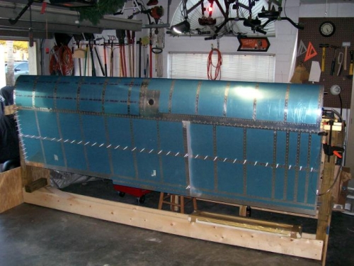 Tank has been completed and tested. It was difficult to get the fittings sealed and the gas cap to stop leaking. Had to add additional sealer to the BNC connector and each corner of the baffle. Finally got what I think is a leak free tank. Today I final bolted it to the leading edge of the spar. I will need to teach Marsha to buck so she can help with the J-stringer then the wing will go into a stand and I will start on the right side wing.