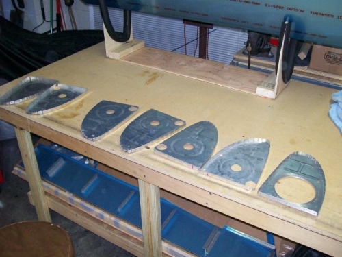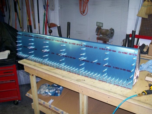 Start work on tank. Deburr ribs and cleco into skin. Cleco in rear baffle and temp. attach rear mounting brackets. Cleco to front spar and match drill ribs and skin to spar. Remove and match drill skin to ribs and baffle.