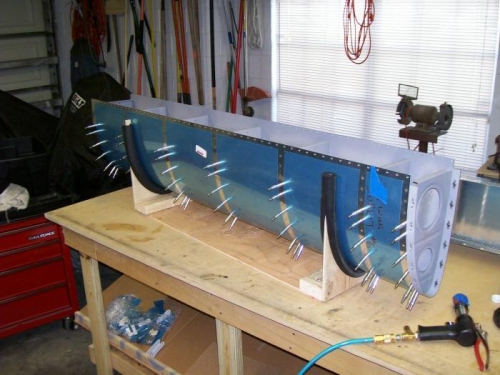 Mixed up thet last of my Pro Seal or also known as Black Death to work on the tank. I removed the clecos one at a time and then wet riveted the ribs in. I added a blob of sealant to the shop head of all rivets and then ran out of sealer. I have more on order but it will be a few more days. I started work on the spar to get ready fro the leading edge and tank by countersinking the spar. Then I removed the leading edge and disassembled. I removed vinyl, deburred and dimpled the skin. Deburred and dimpled the ribs. Cleaned and primed all parts including splice strip. Drilled and dimpled splice strip for plate nuts. Clecoed leading edge assembly together and started riveting. Halfway finished but will need to finish tomorrow.