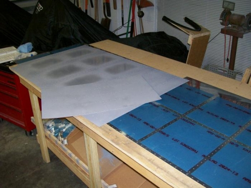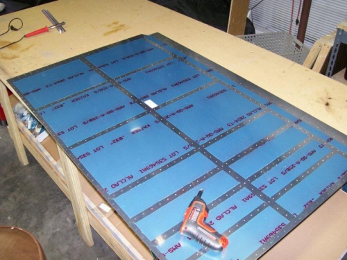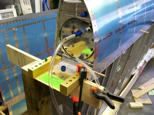 Installed access cover on tank using allen head screws instead of the phillips screws in the kit. This will get me better service later when the wing is in place. I then clecoed the tank to the spar and attached a vinyl hose. I filled the hose with water and then added pressure to the tank. This shows the pressure you have added in inches of waer pressure. Looking very good so far. Started removing plastic, deburring and dimpling top skins. I finished the inboard and doubler and primed. I then got the plastic removed on the outboard skin.