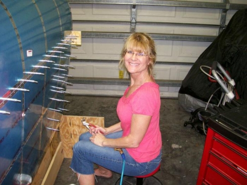 Got Marsha back out in the garage after dinner and we finished the top skins. Still have the top and bottom spar rivets to finish. Match drilled aileron and flap gap fairing then re primed rear spar to cover the assembly scracthes. Then removed plastic and deburred.