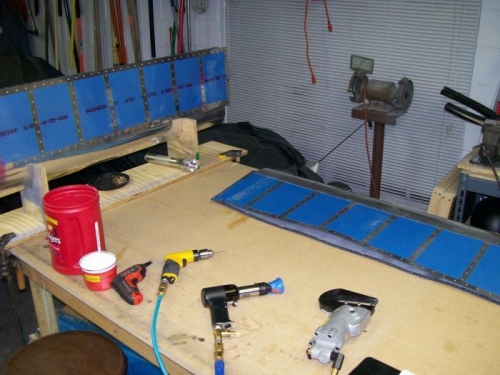 Built a jig for holding the ailerons while riveting skins. Clamped jig to the table and started riveting. Finished both ailerons skin to nose skin to spar rivets. Squeeze rivet skins to main ribs. Clecoed the ailerons to the table. Next is the trailing edge. The directions say to just back rivet the trailing edge but everyone else seems to use the rudder trailing edge method. That is using Proseal on the trailing edge and letting it dry while clecoed to the table. Then back rivet after a couple of days. The board is to hold weights. These will hold the aileron flat on the table while Prosealing or riveting.