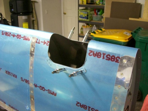 Cleaned and primed the flap spar and skins. I received my new Duckworks landing and taxi lights from Van's. I re-assembled the old wing stand to hold the wings while I install the leading edge lights. RV-7 Chris came by to help me move the left wing to the stand. I had to remove the aileron control rod to mount it on the stand. It had to come out to rivet the bottom skin anyway. I then started on the light. Cut the slot in the leasding edge, cut, shortened and riveted the bracket back together. Drilled the ribs and mounted the nut plates that hold the bracket. mounted the power supply to the outer rib so that it can be acsessed through the wing tip.