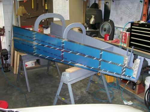 Went to Lowes and bought some heavy duty steel saw horses. Added some wood on top to protect the skins. Started assembly and riveting. I have about 25% of the riveting done at this point. I don't have as much room in the garage as what I did. Plenty of room for the fuse but a little difficult to get all around it. I had already moved the work bench 90 degrees and against the window but I may need to do a little more arranging. The rest of the riveting will take all week Again I am very happy with the fit of the tail cone. It came out very nice.