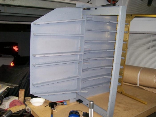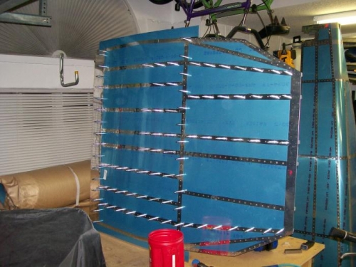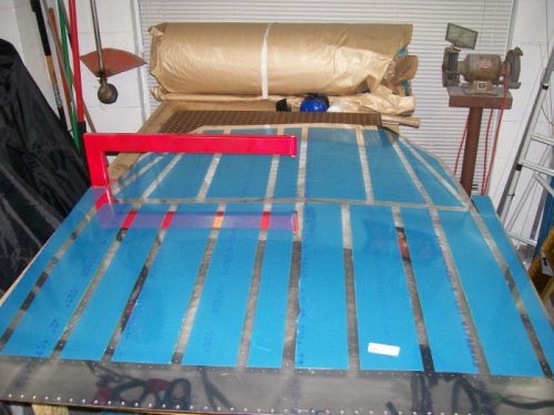 Dimpled center section bottom skin then deburred the edges, cleaned and primed. Worked on skeleton by repriming some of the scatches and then trimming the seatbelt brackets that interfear with the ribs. Rebolted the brackets in place. Then I deburred,cleaned and primed the crotch belt brackets. Clecoed the bottom skin in place and started riveting. Only about 30% done tonight. Probably a couple of hours left to rivet.