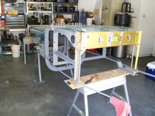 Spent time getting the center section ready for mounting to the aftt section. Deburred the bottom skin where it connects and then dimpled. Deburred and dimpled F-905 and countersunk F-904 where the side skins mount. Primed and painted the arm rests F-904-H and F-905-Z. Added nutplates to the F-915 seat ribs. Deburred and dimpled Baggage corner ribs F-683 then dimpled to bottom skins. Turned the aft section back over and connected the center section and clecoed together. Some people talk about this being difficult but this is my second time and this time was by myself and I had no problem. I will rivet the bottom skin before adding the side skins as this will allow me to do it solo. .