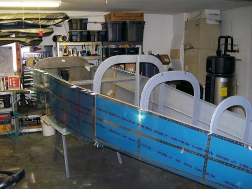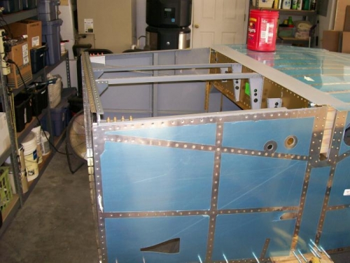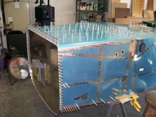 Started the day riveting the skin on the right forward side. Started the lower longeron and after a couple of rivets I realized that the lower longeron should wait until the bottom skin goes on. I drilled those out and then had to drill out the entire lower longeron on the left side that I had riveted yesterday. Finished the right side and then worked on getting ready to do the bottom skin. This took a little preparing to make sure all the holes were match drilled. I prepped the skin, alodined and primed. After the primer was dry, I installed the skin and clecoed the back edge lesving the front open. I mixed some Proseal and applied the the bottom skin and then peeled back the side skins and applied the Proseal. Clecoed every hole. I had Marsha help me turn it back upright. I was able to finish all the side skin rivets. The only rivets left are on the bottom and I can't reach solo. I moved on as if the thing was completely riveted. Mounted the aft deck and drilled. Mounted and drilled the F-683 gussets. Drilled the seatbelt cable attach brackets. Shaped the seatback gussets and finish drilled the side rails. I have a batch of things I can now prep, Alodine and prime.
