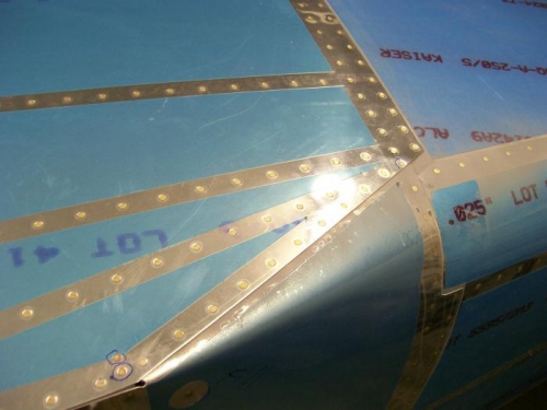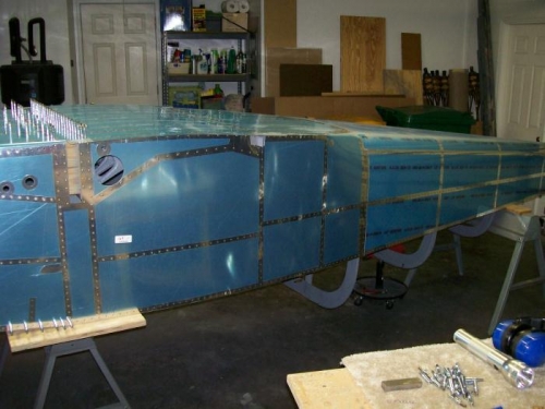 Started finishing up the right seat back and then RV-7 Chris called and came by to help finish off the remaining fuselage riveting. We turned it back over and started on the center to rear to side skin rivetes. Thats as far as we got before 8pm so we will start back up again tomorrow. Still have the lower skin to spar, stiffeners and lower firewal rivets to do.
