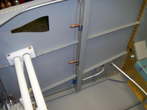 Finished up zip tied the staic line to the F-707 bulkhead. Finished up the fuel vent line for the right side and fuel line for both sides. Started on the brake lines by pulling out all the fittings and lines. Pulled the assembly back out and added the brass fittings to the master cylinders. Re-installed the pedals and torqed the bolts. I spent time looking for the VA-118 braided hoses but gave up and checked VAF and found that they come with the finish kit.