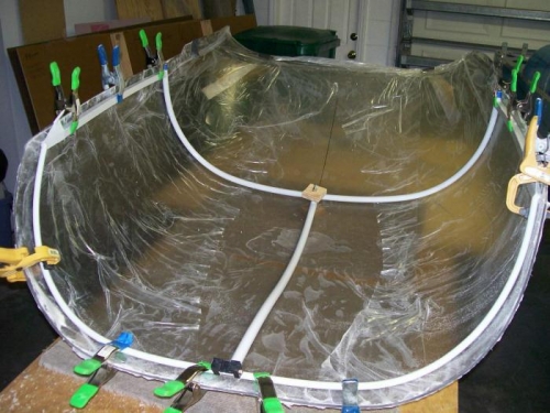 Worked on the bubble tonight. Drilled the latch handle hole. Did a partial trim on the back and sides and then clamped the frame in place.