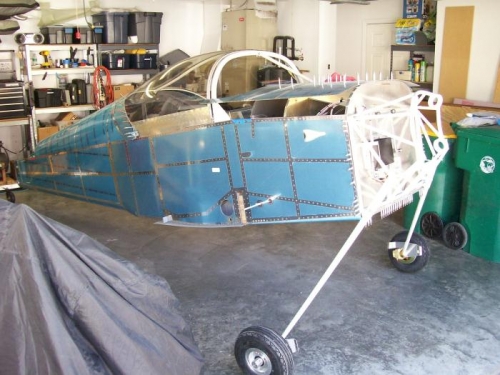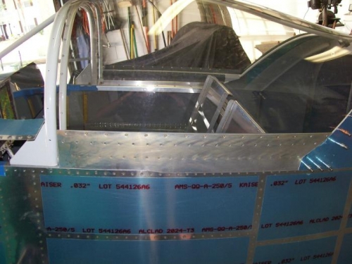 Checked fit of canopy and frame. Pulled it all back apart again and tweaked the frame and trimmed the frame latch tube. Re-assembled and checked fit. Pulled it back apart one more time and then checked fit. This time I was happy so I pulled it back apart again. Started by riveting the center cover strip and canopy to frame. Put the canopy and frame back on so that it would be the proper shape for riveting. I riveted the front frame bow. Pulled it back off the plane and riveted and bolted the side skins to the frame. Put it back on the plane and clecoed the rear skirts. I still need to rivet the rear skirts but the canopy is basically finished and I am happy with the fit. It slides very easy and the side skins have no gap. Spent a little time trimming the lower fuse skin where the gear legs need clearamce. I found it difficult to get the fuse up high enough to get the gear legs in so I will us a strap to pull it up tomorrow.