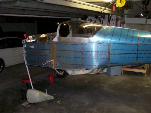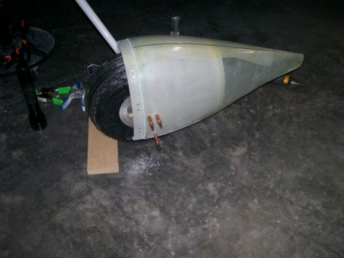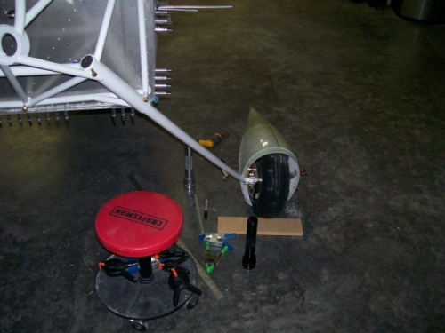 Trimmed the fron pant to correctly fit the rear pant. Sanded for a good fit. Bolted the outer bracket to the axle nut then leveled the plane. Drilled and riveted the platenuts. Trimmed for the axle and fit the pant to the wheel. Drilled to the outer bracket after lining up with the center line of the plane.