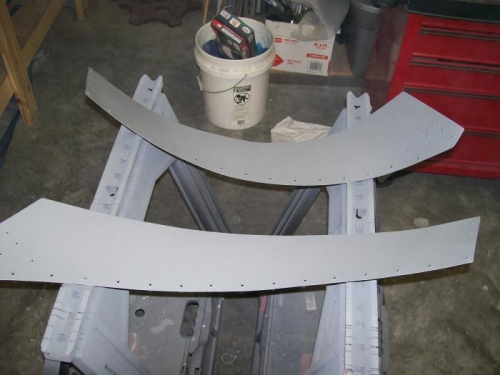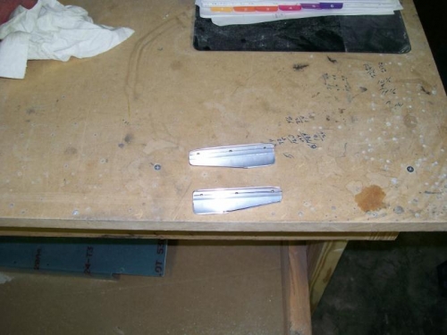 Worked on the rear skirts. Worked on the edges to get a good matching curve. Dimpled holes and then alodined the skirts. Primed and painted. I had decided to install handles on each side at the rear of the side skirts. I cut, shaped, drilled and deburred some angle to use while the paint dried.