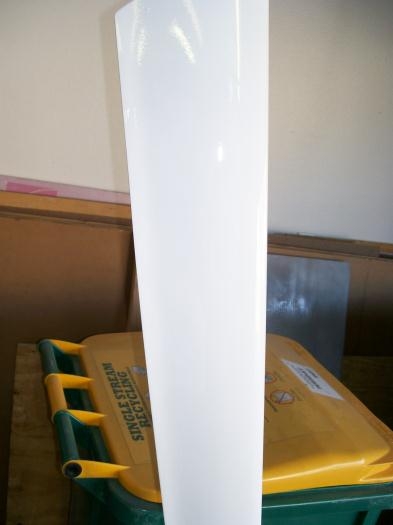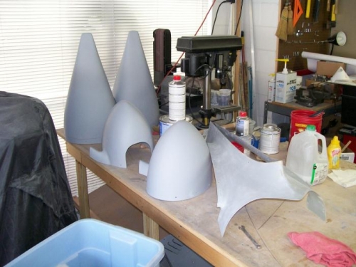 I have been working daily on getting the fiberglass finished. What a pain in the butt. Sand, fill, prime and fill pinholes and then do it all again at least five times. I painted the gear leg fairings as my first base/clear attempt. I am very happy with the results. It is not perfect and I have a clear run to sand and polish out but some people talk about ten foot paint jobs that look good if you don't get closer than ten feet. I think this is a 12" job on the fairings and I think it will only get better with practice.