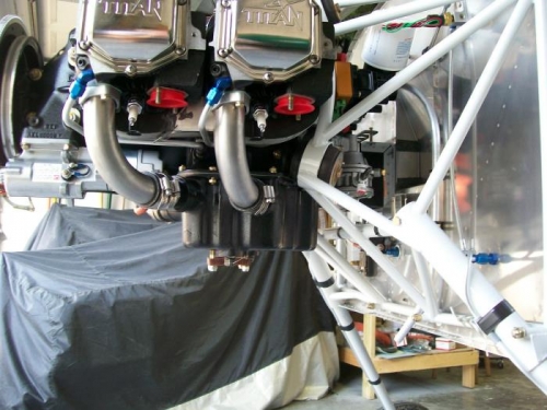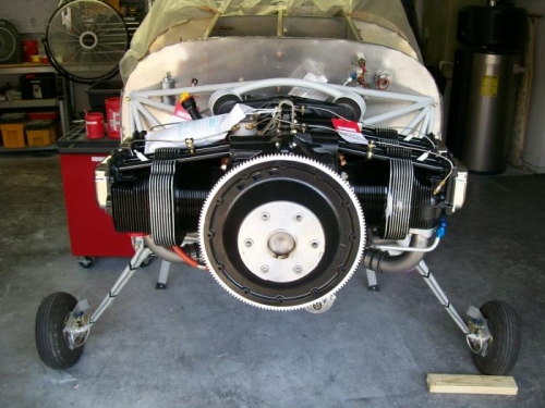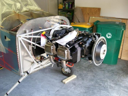 Engine arrived today. I took it home and pulled it out of the crate. Changed a couple of fittings at the rear and started to mount the engine by myself. 50 minutes later it was mounted and torqued. Connected the fuel line, breather tube, fuel pressure hose and oil pressure hose. Mounted the prop extension, clecoed the spinner on and clecoed the top skin back on. layed the top cowl in place and marked the cut line. Cut the rear edge off to a rough cut and set in place.