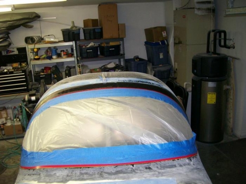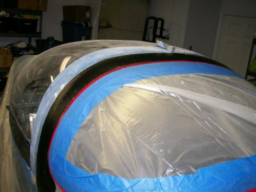 Have I mentioned that I hate sanding? Well tonight was more sanding. On my next plane i will be better at the fiberglass stuff. I made it hard on myself by overlapping the tape with too much glass. This just means extra sanding. I used an electric sander for the top portion and got it to where I was happy. I then pulled the tape off and re-taped in a 1/16 of an inch. I then added two layers of glass to the top. This time I made a good cut on the glass and then lined it up perfectly with the tape edge. Next session I will do the same for the bottom edge.