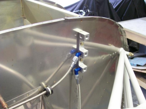 Started a few of the small things I need to get done before the engine arrives and gets mounted. Mounted the sensor block. Drilled the firewall for the fuel line and added a doubler and fitting. Drilled for a cushion clamp and riveted a platenut to the back side of the firewall. This clamp is for the oil breather tube. Connected the oil pressure hose to the sensor block.