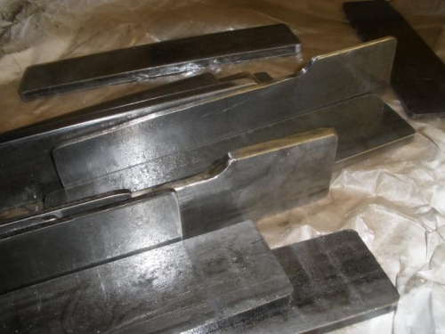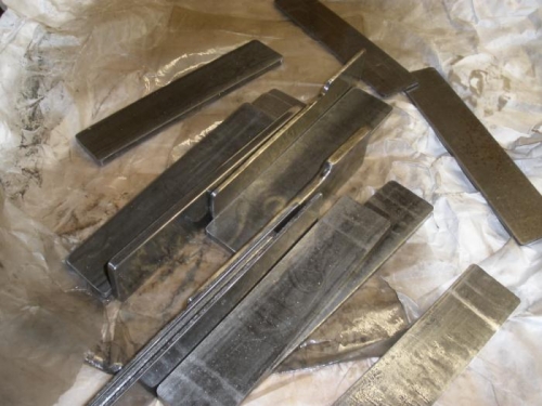 Rough cut out 16 pieces of 4130 steel, 8 of them 1/8 in by 7 in by 1.5 in, and 8 of them 1/4 in. by 7 inch by 1.5 in,. for wing attach fittings. On two of them I made the cutout for clearance of the spar cap, need to make that cut on six more. All need some more edge treatment and general polishing before these will be done.