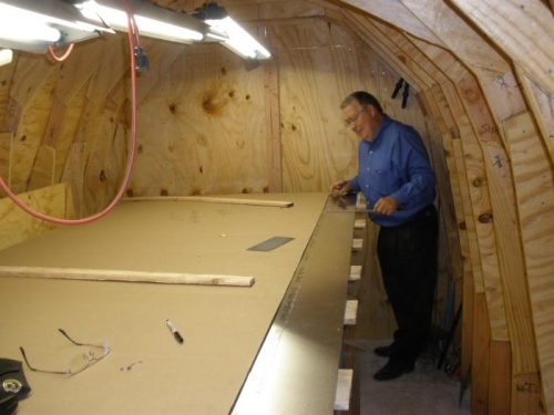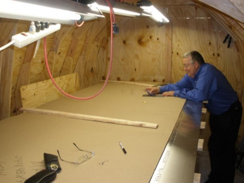 cut out spar webs, 5.5 inches by 93.5 inches, 2 of them, plus 5.5 inches by 35 inches for the center section spar carry-through, from the 0.040 aluminum sheet. Need to figure out what else to cut from the 0.040 so I can get it off my work table. I tried to use a techniquie I had read about somewhere for these long straight cuts. The story was that you could score the aluminum sheet with a special knife, and then break it like drywall. This sounded good to me, and in Image 2 I am sharpening the special knife, and in Image 3 I am scoring the sheet. But the "breaking" part did not work for me....I ended up making the cuts with a jigsaw.
