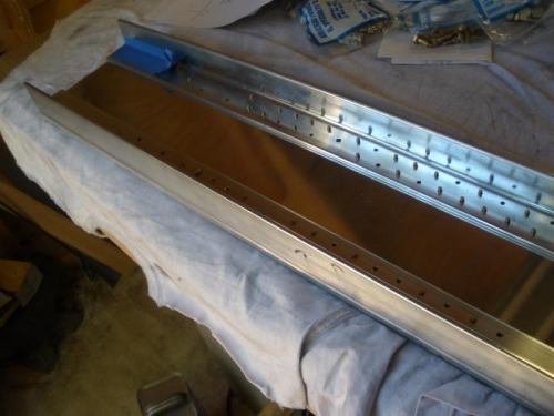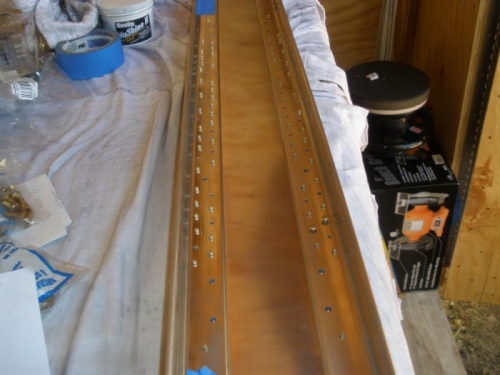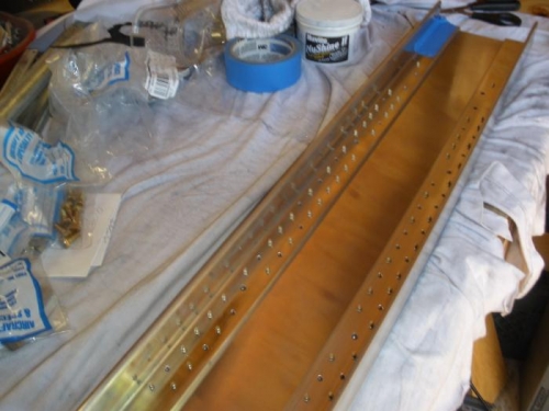 Finished drilling holes for all the AD 4 rivets, and for all the AN 3 bolts. Disassembled everything, deburred all the holes. Used Nuvite F9 to polish out all the scratches in the spar web, so it's reflecting the plywood ceiling of my shop....looks kind of like a wood-grain spar. I would have riveted it together today, except for the fact that my AN470 AD-4-13 rivets are on back-order...so I guess I'll have to put this aside and work on something else. The wing spar caps need notching and deburring...guess I'll do that tomorrow.