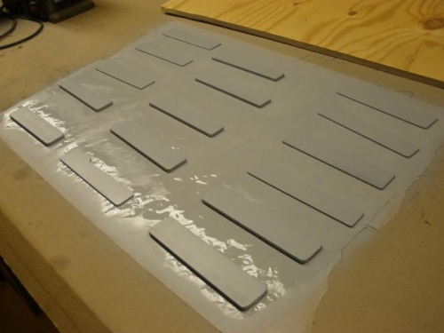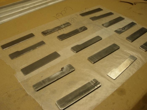I completed the final shaping of the 4130 reinforcing plates, gave them a good deburring and edge polish, then painted them with SEM self-etching primer. I also tried a different approach to smoothing the long cuts in the spar caps. I got a bench-mounted belt sander and it shows some promise for polishing the cut edges on the spar caps.
