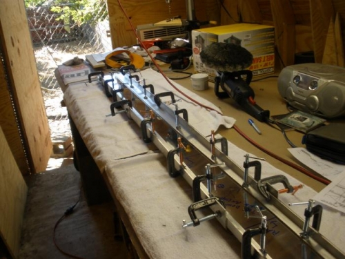 I trimmed the seven-sixteenths inch triangle off the root end of the spar web and spar caps, then assembled the left spar into the assembly jigs. drilling the rivet holes is about half done