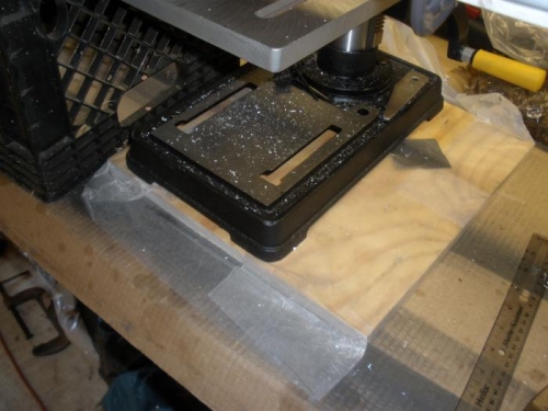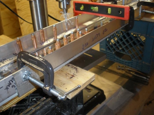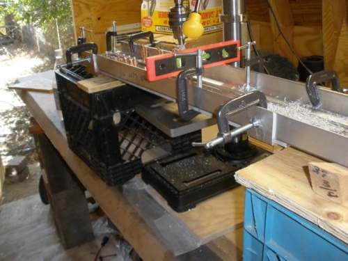 I got tired of moving the spar past the drill press, and having to re-level it after each move. so I set the drill press on a piece of plywood wrapped in waxed paper so it would slide around easily, and set the spar up on some supports clear of the drill press table. That way I could do 15 or 20 holes before having to stop and re-position everything. The drill press slid back and forth in the space between two supports.