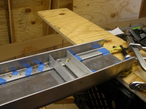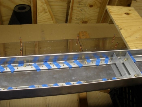 I match-drilled and bolted on the first two rib attach angles on the center section spar carry-through. This was kind of a hassle, made unnecessarily difficult because I decided to drill the bolt holes during the rivet hole drilling step. I thought this would be a good Idea because I could use the bolts as additional clamps to hold the spar caps in place for rivet hole drilling. But now I have to take some extra pains to get the rib attach angles lined up on the holes and match drilled. The lesson learned is that anything that needs to be assemled together needs to be drilled together. So on the wing spars I will wait to drill the rib angle holes until they can be drilled with the angles clamped in place.