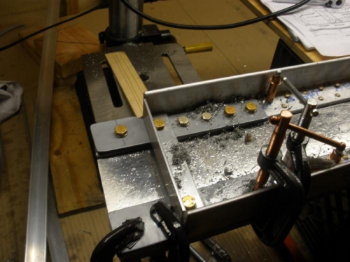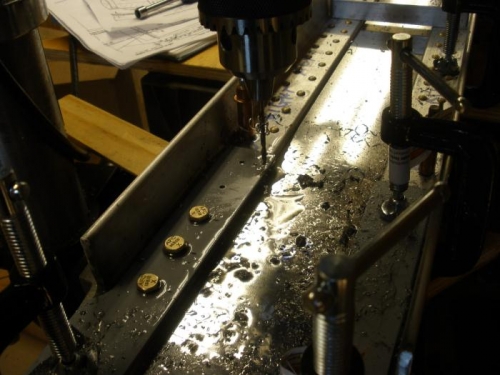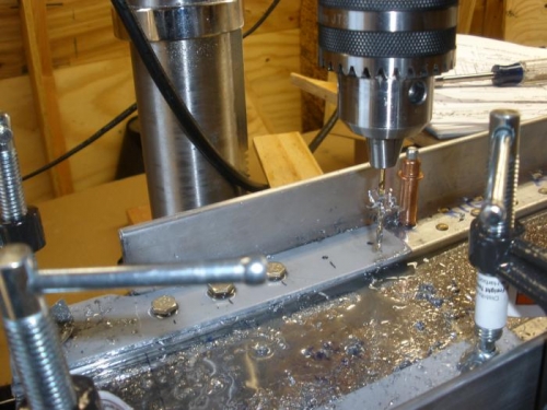 I made some progress in attaching the 4130 steel plates at the wing root. This is very slow going, because I drilled the first holes at 7/64 ths then stepped up the hole diameters 1/64 th at a time, up to 15/64 ths, then used a chucking reamer to ream the holes to exactly 1/4 inch. Takes a lot of cutting oil. But the holes come out nice. Good practice for the 1/2-inch main attach bolt holes after dihedral setting.