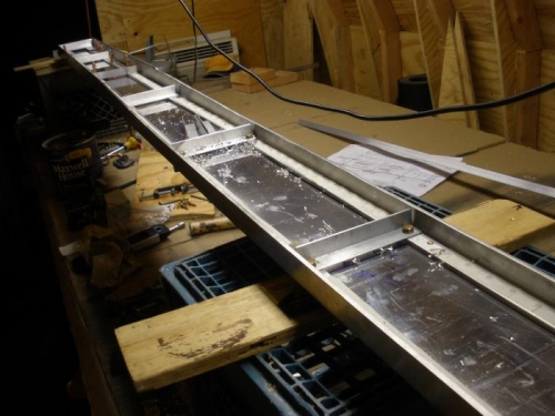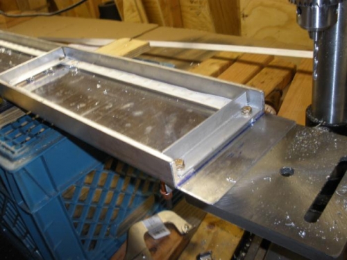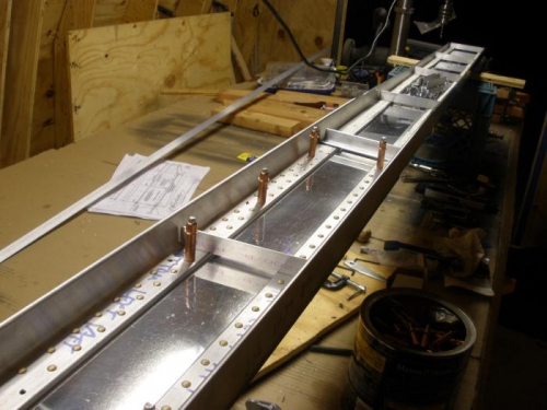 I taped the rivets in place on the spar caps, and set the left spar aside to wait for a tech counselor inspectiton. Then I put the rivets into the right spar caps and began attaching the rib attach angles. this was a slow process because all the rivets I had cut down from -12 to -11 had a little burr on the side that prevented the rivets going in right. So before I could put the rivets in place I had to sand off those burrs.