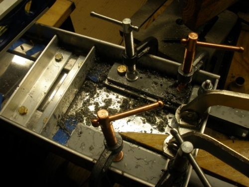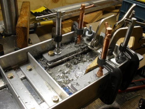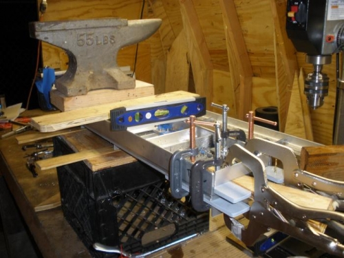 I started drilling and bolting the 4130 steel plate in the upper right-hand corner of the spar carry-through in the center section. Getting everything clamped into position took awhile, so I only got two holes drilled tonight.