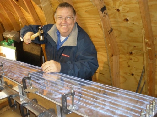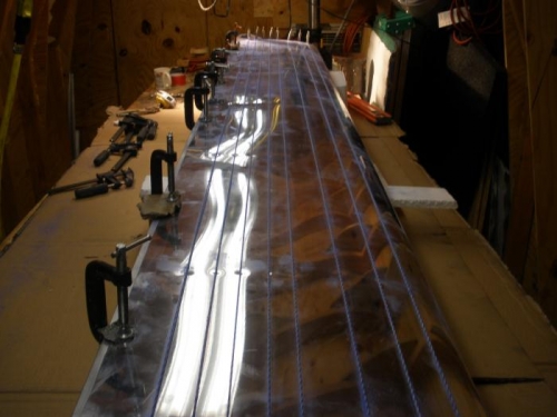 I used the ratchet straps to test fit the leading edge skin onto the spar/ribs assembly. Looking good. I used chalk lines and a prick punch to mark rivet hole locations.