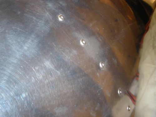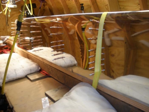 I up-drilled all the rivet holes from #40 to #30 and replaced the 3/32 nd clecoes with 1/8 th clecoes. I then removed the skin, deburred the holes in the ribs and in the skin, and re-assembled the skin to the ribs. I began riveting, but ran out of rivets after finishing the upper surface. So I will have to pause this process while I get some more rivets. I guess this is as good a place as any to note lessons learned in doing this first leading edge, and things I want to do differently on the second leading edge. The first thing is to refrain from drilling the skins to the ribs at ribs 1 and 7 until last, instead of first as I did with the right wing. The second is to wrap the ratchet-strap clamps around the leading edge plus a four-by- four or two placed under the spar. This will make the straps pull straight down past the spar, instead of making a right turn and pulling inward immediately behind the spar. I need to make sure that the skin lands properly on the first rivet-hole position on both the upper and lower surfaces of each rib before plotting the locations of all the rivet holes.