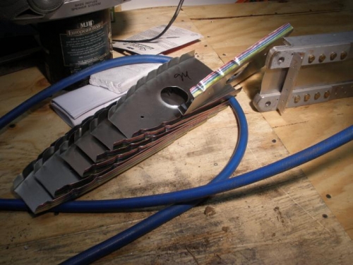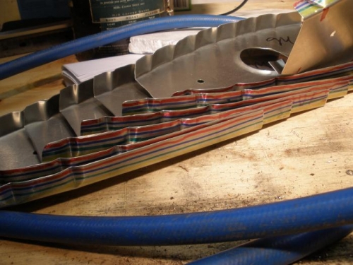 I drew a series of stripes with colored sharpie markers to help me find the right spots on the ribs to drill holes to match up with holes previously drilled in the skins.