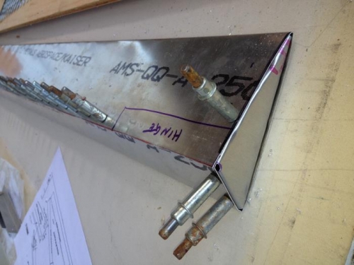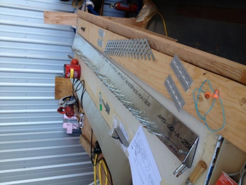 I finalized the bends in the aileron skins, then fabricated the end ribs for the right aileron. I clamped down the aileron on the table to hold it straight. Then I drilled and clecoed the rivet holes in the right aileron.