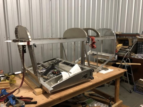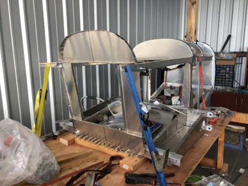 Rivetted the seat back (Bulkhead F6) to the rear of the center section, Installed some of the cap screws I'm using to attach forward longerons to angles on back of firewall. Installed the countersunk machine screws holding the reinforcing bar for the landing gear to the lower longerons. removed the bracing and strapping that had been holding the forward fuselage in alignment. nice to see it in a self-supporting condition.