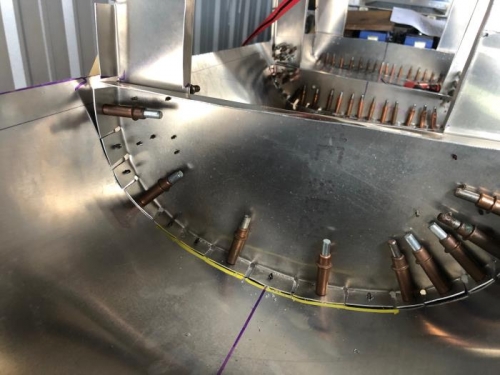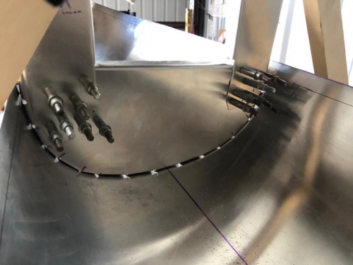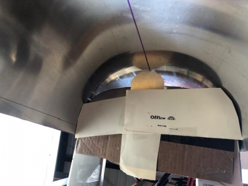 Decided to remake the bottom of bulkhead F 9. it was flat on the bottom, but the skin really wants to be round in that area, so I am going with it. Taped together a bunch of segments of file folder paper in the shape the skin wants to take, then traced that shape onto a piece of poster board, which I then used to make a forming block. The new frame fits real nice. I also raised the fuselage up on concrete blocks so I can get in under it to drill and cleco the overlap of bottom skin to center section.
