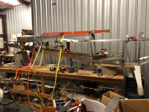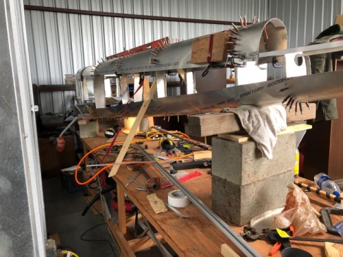 with fuselage elevated on concrete blocks, reached under the center section and drilled the overlap of fuselage skin over center section skin. Removed all clecoes on that skin, deburrred all holes, reattached skin. Riveted the center section overlap, and also riveted all the bottom sectors at each bulkhead. Left the upper edge of the skin free to allow for placing longeron and/or skin flange. Also noted that there may be a slight twist in a counter-clockwise direction when standing at the tail and looking forward. At this early stage it should be possible to correct that twist, but need to do that next before any more riveting.
