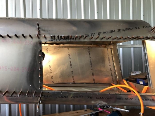 Started fitting the 0.020 skins to the aft fuselage on the left side. In order to do this, had to remove the skins from the right side (one at a time) to allow access for back-drilling the rivet holes through the longerons. This is going much better on the left side than it did on the right side.