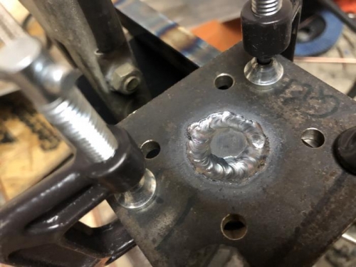 Finished and installed the axels. Or at least the axel prototypes. I am reasonably happy with the way these came out, and they will be fine while I'm building but I may make a better set before I fly with it. Image 1 below shows the first weld, which used no filler metal, just melted the bolt and base plate together as deeply as I could get it. I followed this up with a pass using filler metal to get it as close to flush as I could, just a little grinding required to get it nice and flat. Image 2 shows the finished axels, and Image 3 shows one installed with the brake caliper and holder.