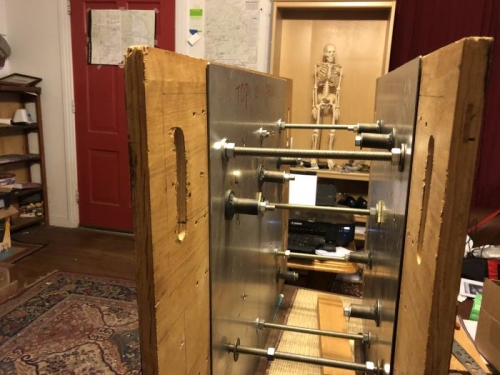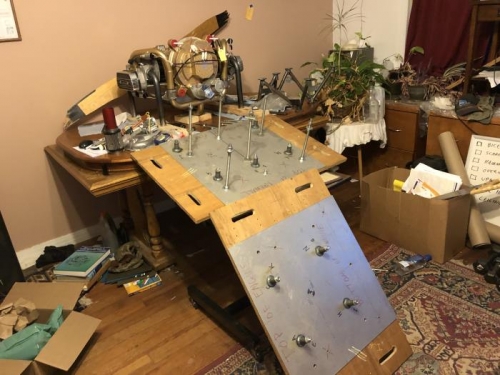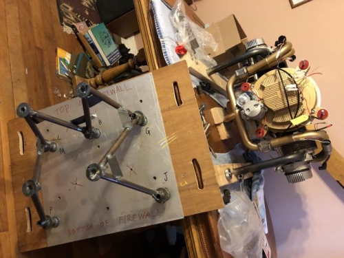 Used motor mount 1.0, the first draft, as a gauge to verify positions of the standoffs on the two halves of the assembly jig. Once I was happy with the placement of all the standoffs on the engine side and the firewall side, the next step was aligning those two sides and using all-thread rod to fix them in position relative to each other...flat, parallel, and a consistent distance apart. Tomorrow's task will be cutting the eight tubes and forming the proper angles and bevels on their ends.